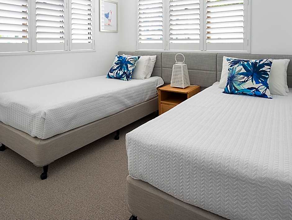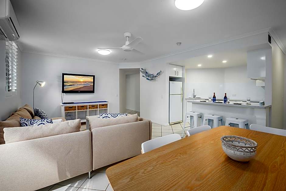 This renovated, air-conditioned apartment has ocean views from Point Cartwright to Noosa. Located at the front of the building, this fully self-contained apartment has a fully equipped kitchen and laundry facilities. There is a lounge and dining area featured. The master bedroom has an private bathroom and TV. All bedrooms have ceiling fans.
