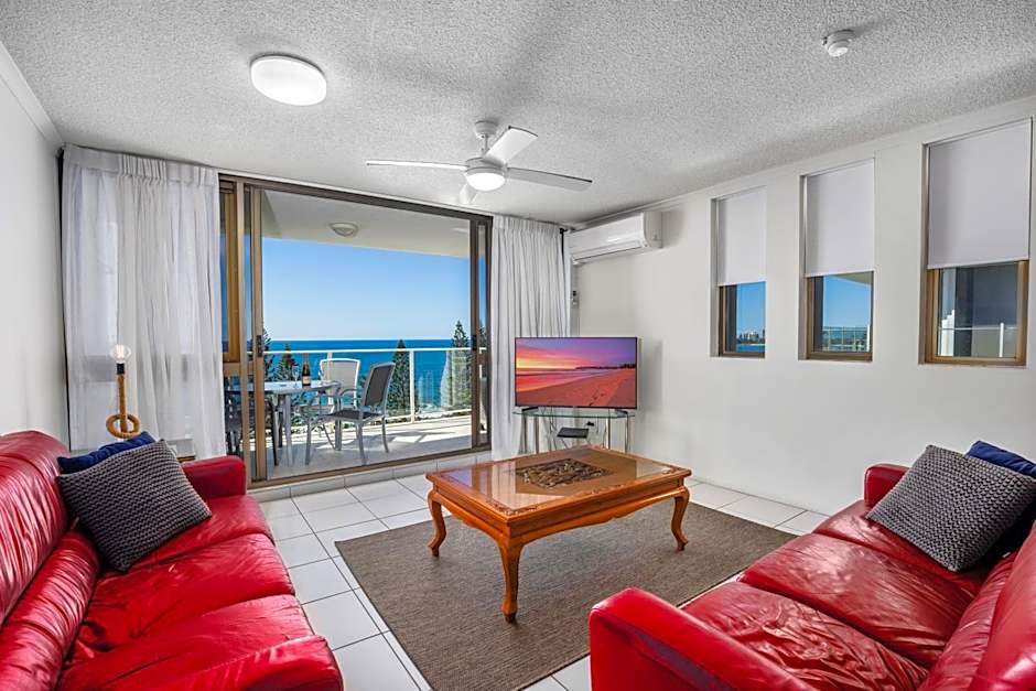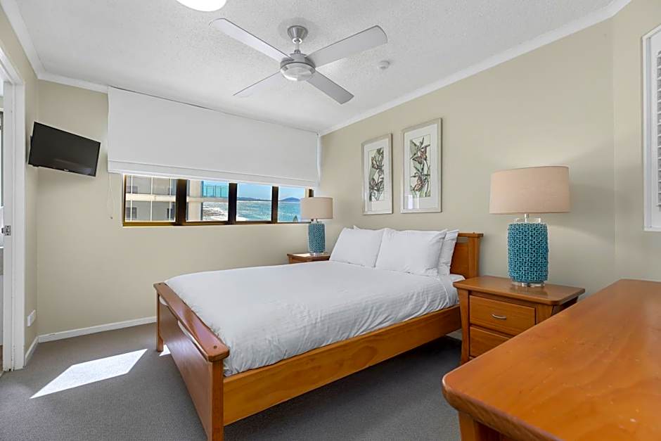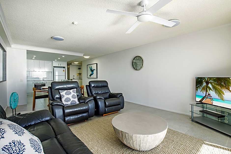 This renovated, air-conditioned apartment has ocean views from Point Cartwright to Noosa. Located at the front of the building, this fully self-contained apartment has a fully equipped kitchen and laundry facilities. There is a lounge and dining area featured. The master bedroom has an private bathroom and TV. All bedrooms have ceiling fans.